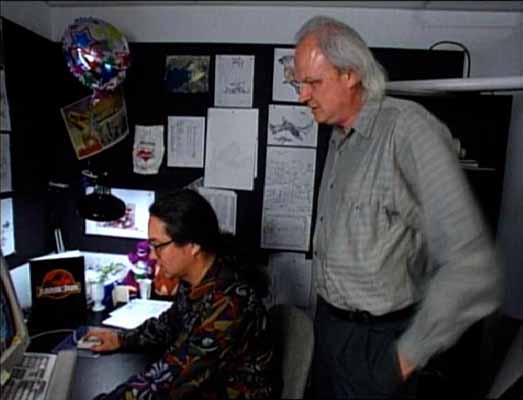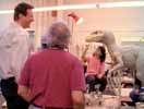Týčiaci sa T-rex v životnej veľkosti Michael Crichton si obzerá animatroniku velociraptora Latexová hlava raptora Dennis Muren vysvetľuje svoju vízie