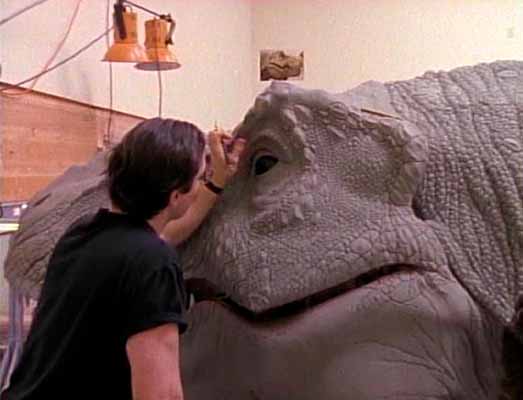 Hotový tyrannosaurus Stan Winston predvádza Stevenovi tyrannosaura Hlava dilophosaura, ktorý zaútočí na Nedryho Práca na detailoch pokožky